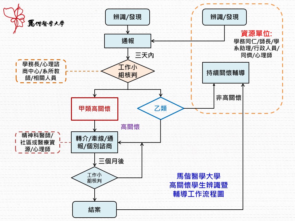 高關懷學生通報流程 2026-02-10 相關檔案輔導工作計畫輔導通報單 通報窗口 學務處 學生安全事務專區 心理諮商中心 張意臻(02)2636-0303#1183ida1289@mmu.edu.tw 葉瀚陽(02)2636-0303#11360978-303-123k760827king@mmu.edu.tw 蘇守怡(02)2636-0303#1182susouyi@mmu.edu.tw