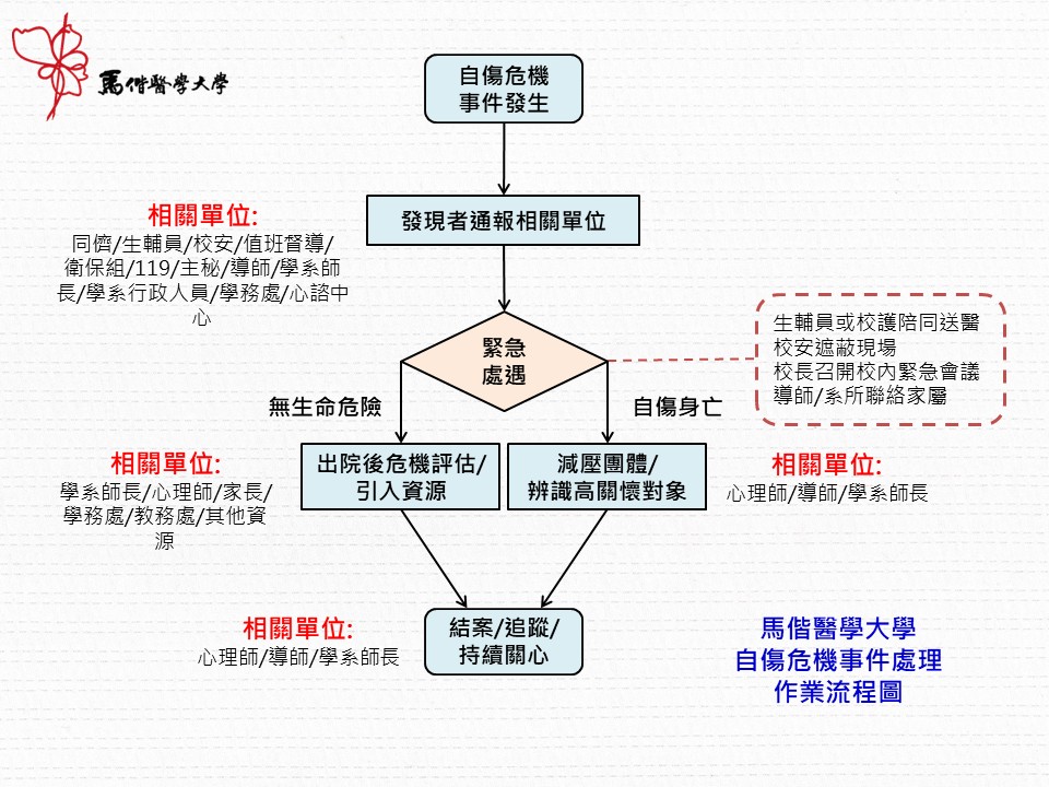 自傷事件轉銜流程 2026-02-10 學生安全事務專區 心理諮商中心 葉瀚陽(02)2636-0303#11360978-303-123k760827king@mmu.edu.tw 蘇守怡(02)2636-0303#1182susouyi@mmu.edu.tw